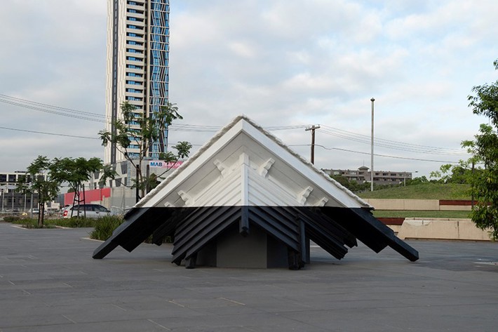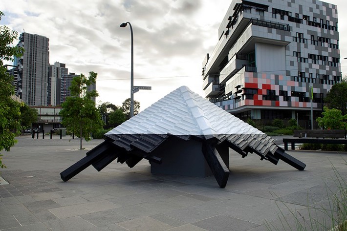 Featuring a large pyramid-shaped section inspired by Montague house roof-peaks, Waterlines is representative of homes and communities around the world affected by global issues such as climate change. It explores this area's changing relationship to environments such as changing water tables, water management, global warming and urban flooding. The 'lines' reference the markings left on homes after waters recede, and the colouring represents the history of industry in the area.