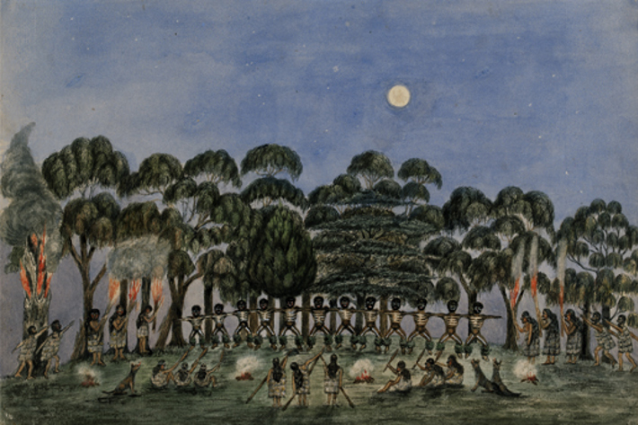 Ngargee held on Emerald Hill (today the site of the South Melbourne Town Hall) in 1840. A corroboree on Emerald Hill in 1840, 1875, W. F. E. Liardet. Courtesy State Library of Victoria