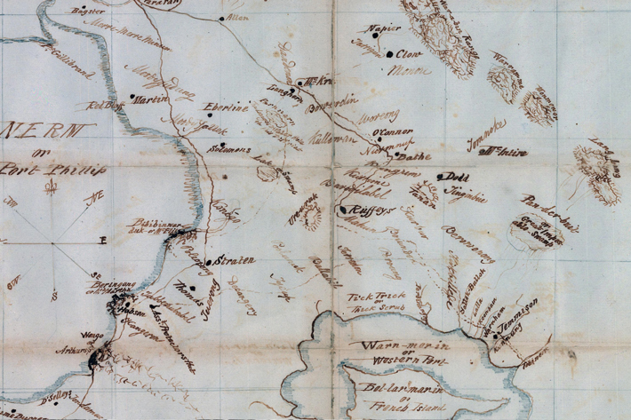 William Thomas’ map of 1840 showing Nerre nerre minum or South Melbourne.Journey to Westernport. PROV, VPRS 11 Unregistered inward correspondence to the Chief Protector of Aborigines, Reports and Returns & VPRS 4410 Aboriginal Protectorate Weekly, Monthly and Annual Reports and Journals, reproduced with the permission of the Keeper of the Public Records, Public Record Office Victoria, Australia