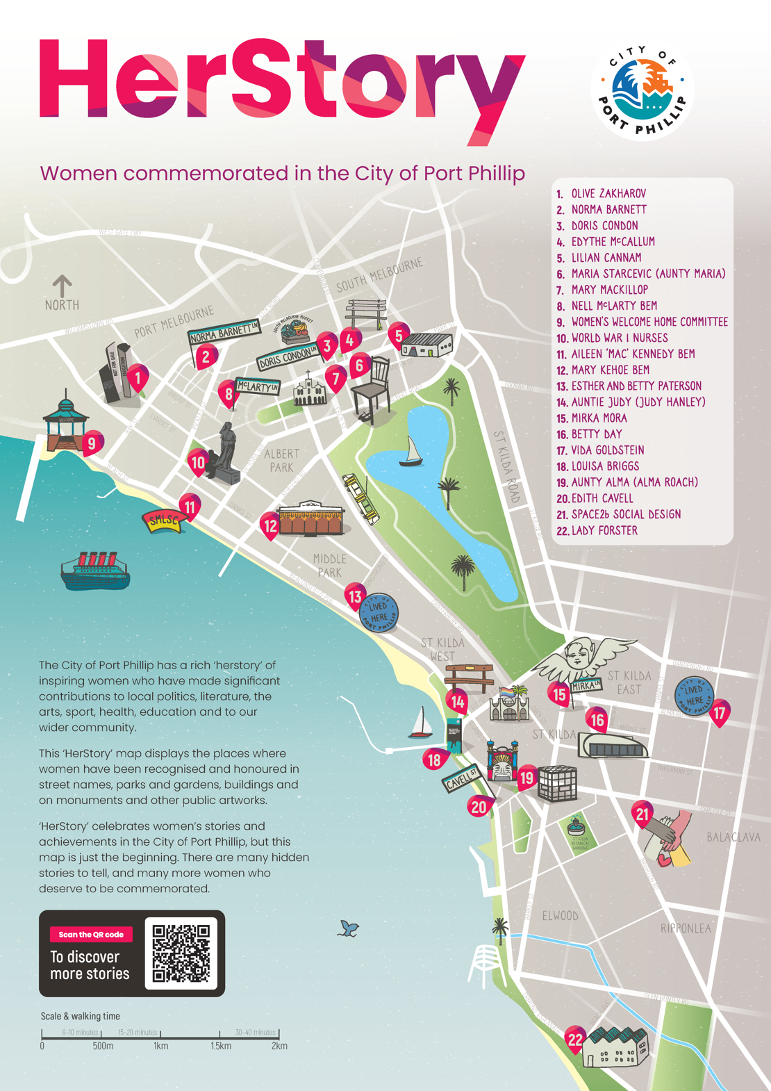 The ‘HerStory’ map displays places in the City of Port Phillip where women are recognised and honoured in street names, parks and gardens, buildings and on monuments and other public artworks. This map is not intended to show all the women who should be commemorated but are not yet.