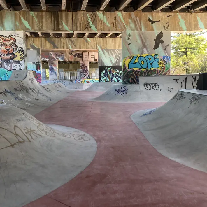 Underneath the Graham Street overpass has been transformed into a multi-recreation site with a skate park and adjacent asphalt basketball courts.