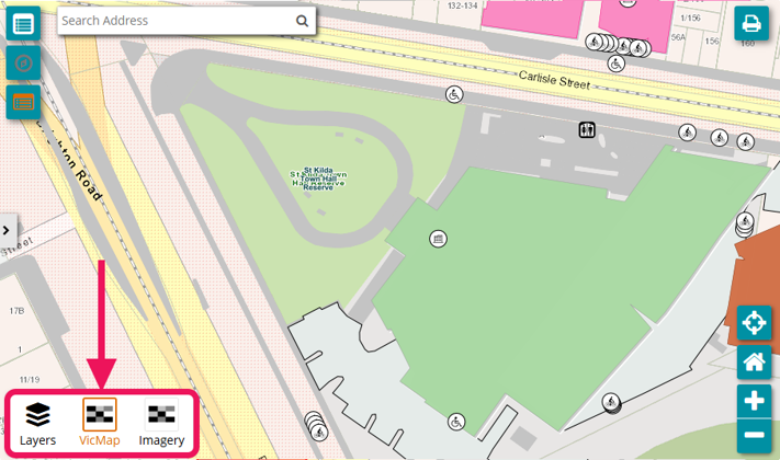 Use the layers button to select between State Government Authorised data (Vicmap) or aerial imagery.