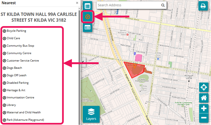 To find facilities nearby your address, you can select the compass button. Expand the category that you are interested in to find the closest facility or venue to the address you have selected.