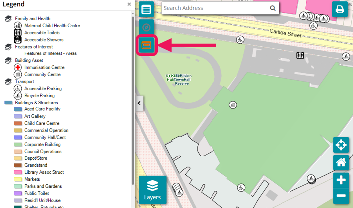 To find out more information about the symbols on the map, select the legend button on the left of the map.
