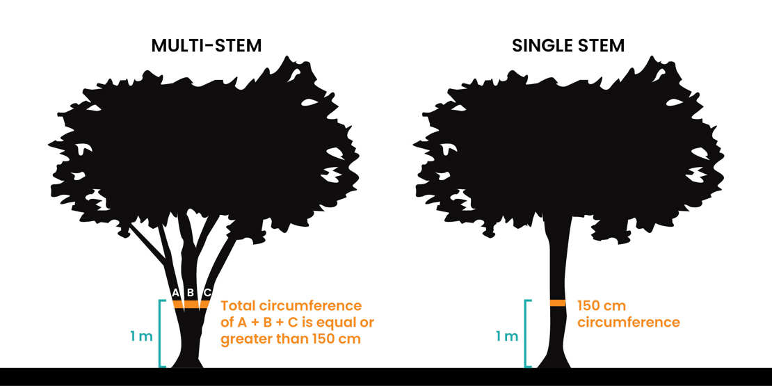 - a multi-stemmed tree where the circumference of its exterior stems equals or is greater than 150 centimetres when measured 1 metre from its base or
