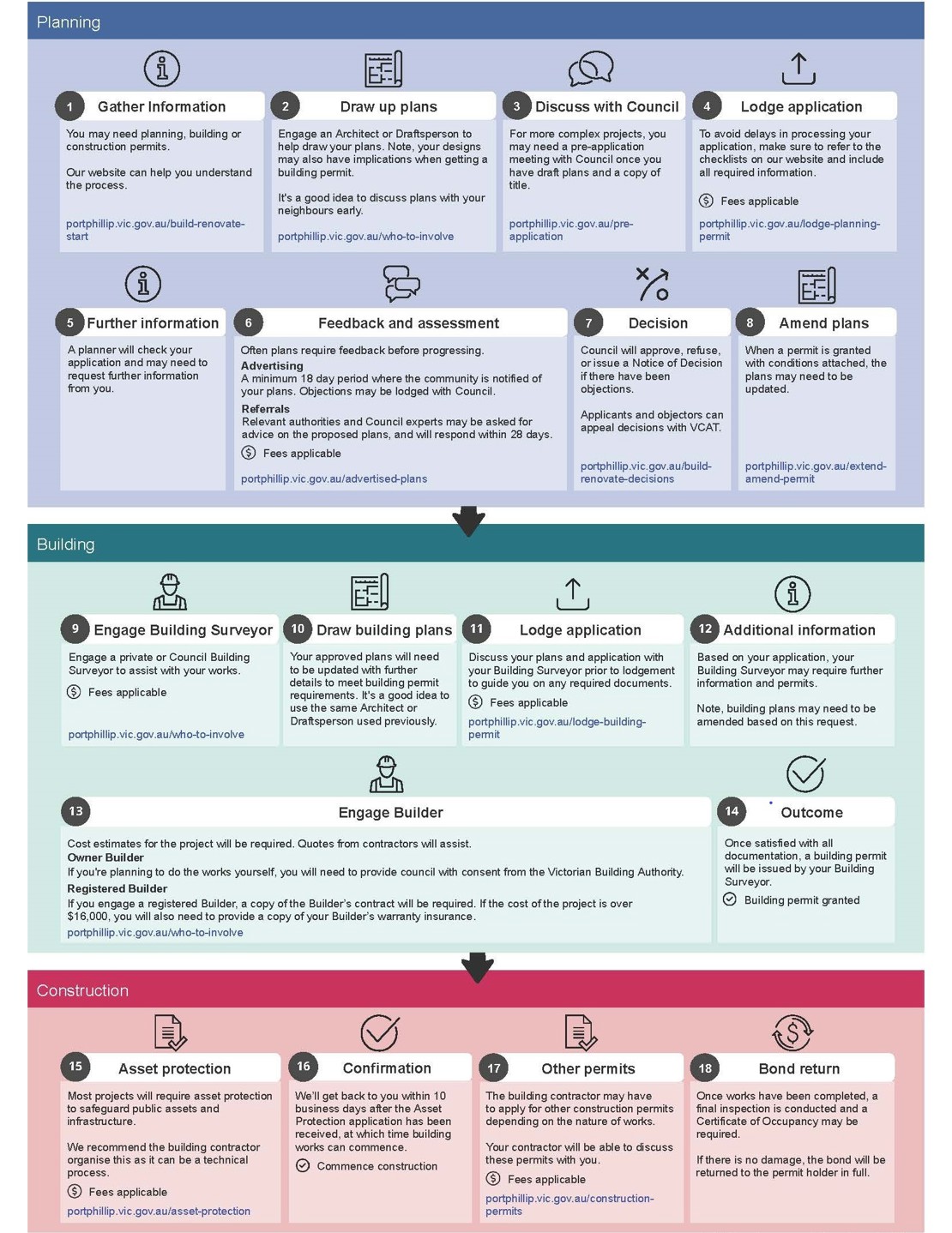 The infographic below helps you understand the steps you’ll go through to get your plans approved and building work done.