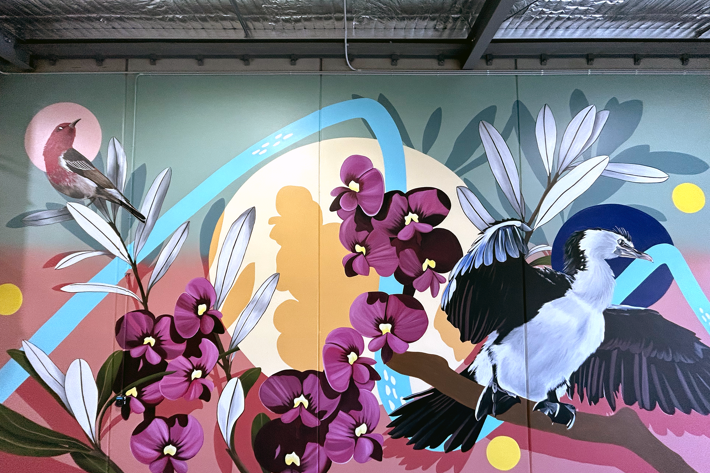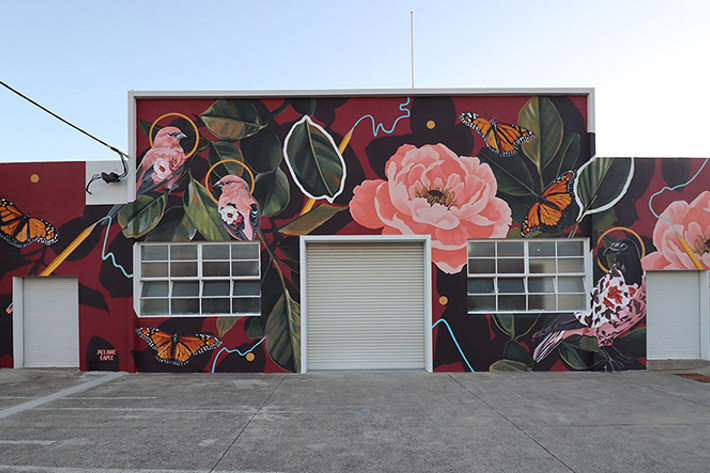 Over the last decade she has developed her practice to incorporate finely detailed oil paintings and large-scale exterior murals. Examining our relationship with the botanical world around us with a focus on immortalising a sense of place, she uses native flora, colour and avian species to activate walls and canvases to draw attention to the fragility and vibrancy of our landscape.