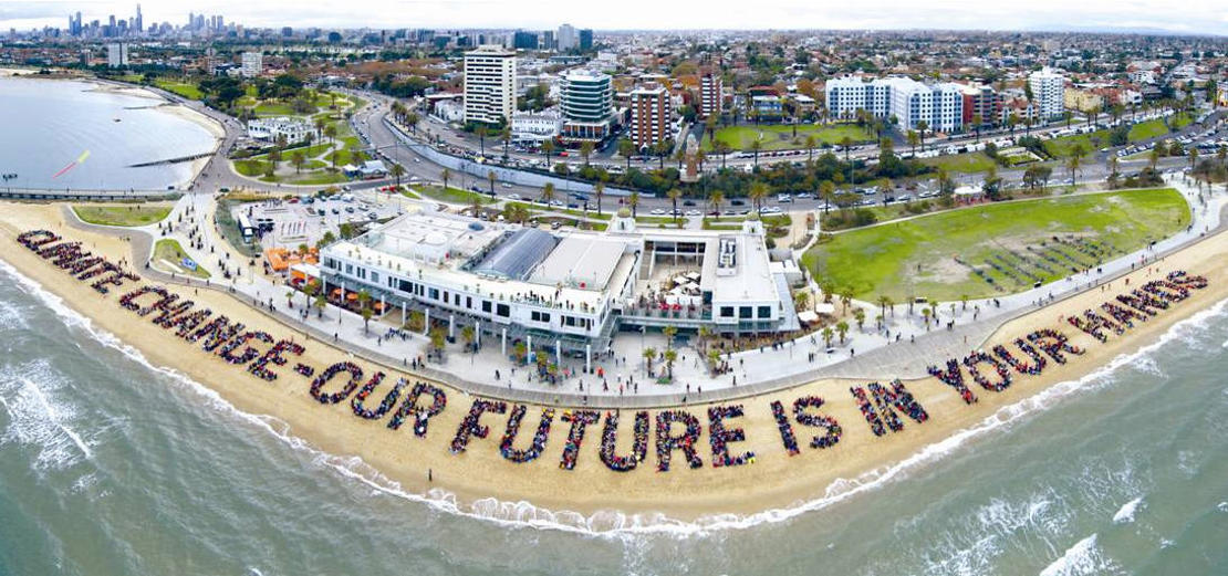 Over 6 months I gathered the people that would be in this human sign on St Kilda beach. Local primary schools in the area got involved, there were about 15 schools altogether from Port Phillip to Bayside, Stonnington and Glen Eira.