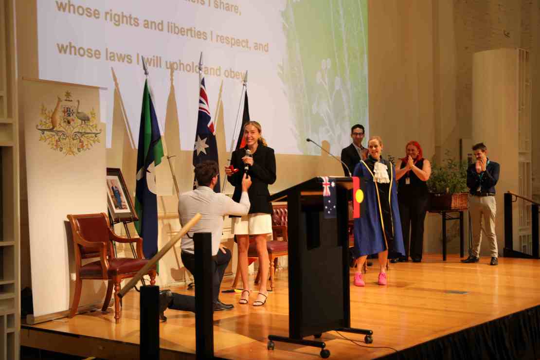 After Marcus spoke to our Council, the plan was hatched for Mayor Louise Crawford to ask Karina to come up on stage to receive a commemorative Port Phillip pin. Marcus followed her and then presented the ring.