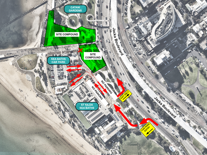 - Traffic management will be in place to regulate construction vehicle movements around the Sea Baths car park, Jacka Boulevard, and Pier Road.