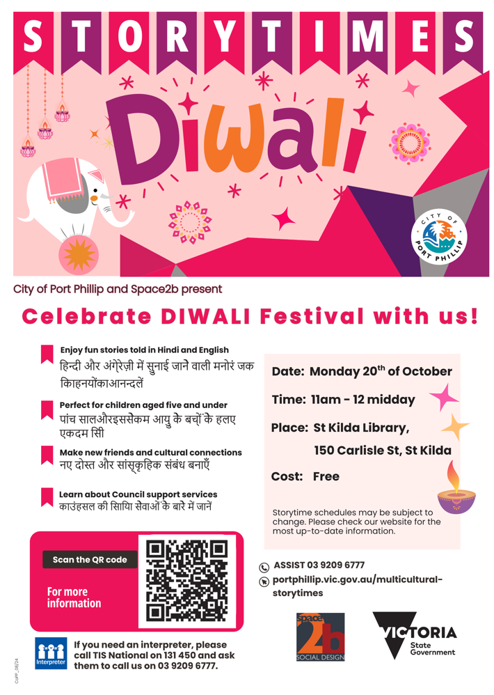 We’re working with Space2b to bring you Multicultural Storytimes in four languages – Amharic/Tigrinya, Arabic, Hindi and Mandarin.