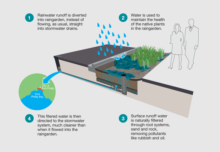 WSUD is incorporated into the stormwater system at 238 locations throughout our City, including the rain gardens at Fitzroy Street in St Kilda, Coventry Street in South Melbourne and Carlisle Street in St Kilda East.