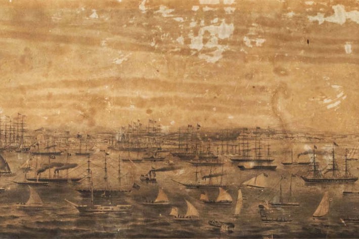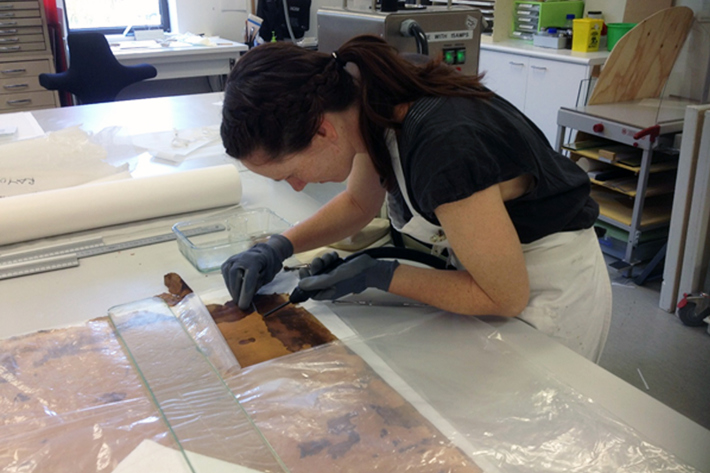 Conservation treatment of the original Liardet lithograph, “View of the North Shore, Port of Melbourne”, 1862, was performed by a paper conservator at the Centre of Conservation of Cultural Material in 2014. Image courtesy Grimwade Conservation Services, University of Melbourne, 2015