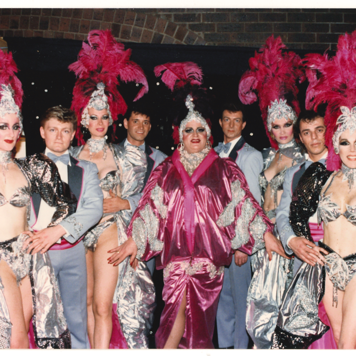 Doug Lucas (centre) and the cast of Pokeys in costume, Prince of Wales Hotel, St Kilda, c.1980s, courtesy of the Australian Queer Archives.