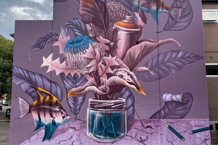 Alex Sugar is a Melbourne-based realism painter well-known for his large-scale murals and studio works depicting native Australian flora and fauna. He has a particular interest in merging this distinctive style with still life and surreal components.