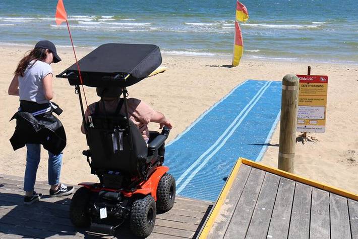 Port Phillip City Council has partnered with St Kilda Life Saving Club to provide the all-terrain, Powered Beach Wheelchair for use by the community, free of charge at St Kilda Beach.